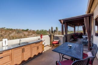 We created a large outdoor living area for entertaining. This beautiful adobe style home’s first floor was built below grade level. The second story of the home is dedicated to the main living space with the kitchen, living room, and dining room. By expanding the deck, and integrating an outdoor kitchen, we created a much larger living space for their home.