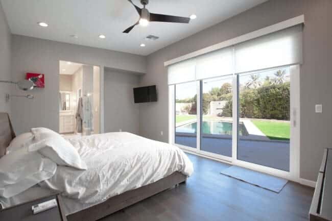 The bedroom provides generous space while maintaining clear circulation paths. Sliding glass doors open directly to the backyard, reinforcing the connection between indoor and outdoor living.
