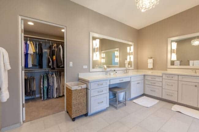 Dual-height vanities allow for both standing and seated use, while walk-in closets include features such as pull-down rods to improve accessibility.