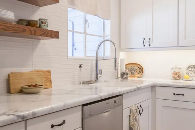 We selected marble-look countertops to complement the white Shaker cabinets. These provide the sophisticated appearance of natural marble without high maintenance, reflecting light beautifully and enhancing the bright feel of this modern kitchen design.