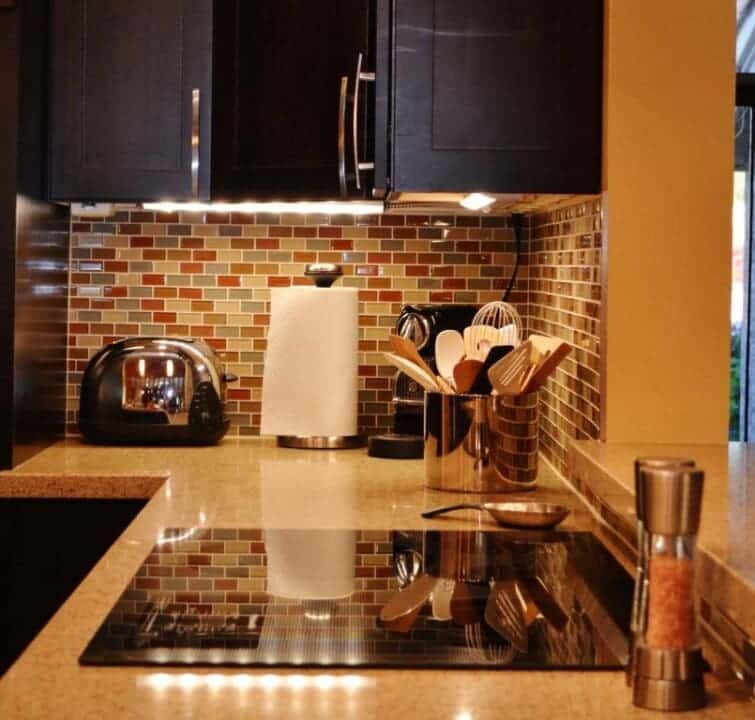 Behind the cooktop, a multi-colored glass mosaic backsplash adds movement and reflects light, helping the kitchen feel brighter and more dynamic. A sleek glass and stainless steel hood creates a contemporary focal point without overpowering the space.