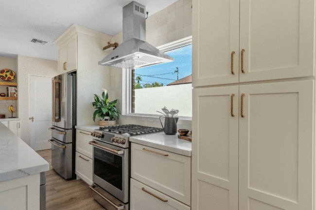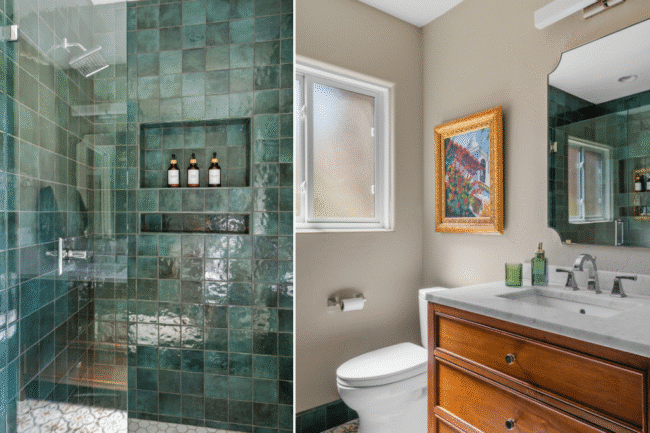 The master bath became a fully accessible en suite, with a curbless shower, double bowl vanity, widened water closet, and arched doorways inspired by the home’s original architecture. The guest bath got Spanish Colonial floor tile and rich 4-inch green wall tile that’s honestly stunning. The kitchen features quartz countertops, custom cabinetry, and under-cabinet task lighting.