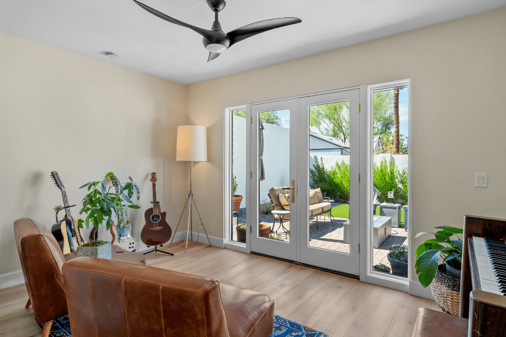 - A third bedroom converted into a music room with French doors to the backyard