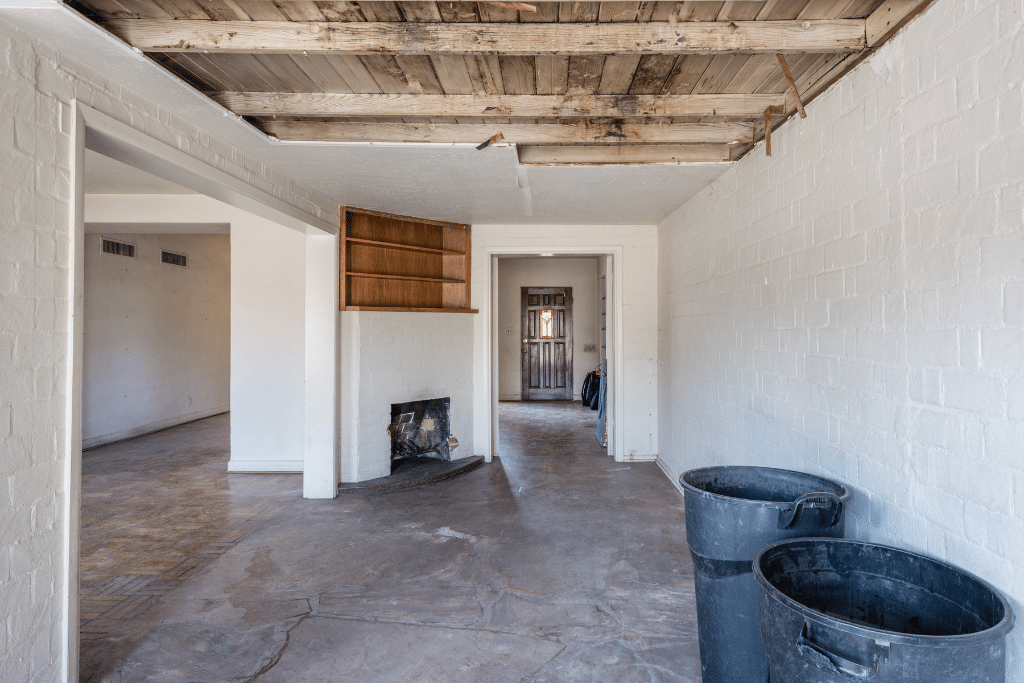 The den had no stem wall, no weather-resistant envelope, and a roof leak that had caved in the ceiling. We rebuilt the entire thing from scratch: new exterior walls, ceiling, and roof structure. We raised the ceiling to match the dining room and ran new ductwork through the framing trusses. The doorway connecting the den to the dining room was plastered to match the other original openings in the home. You’d never know it was ever a problem.
