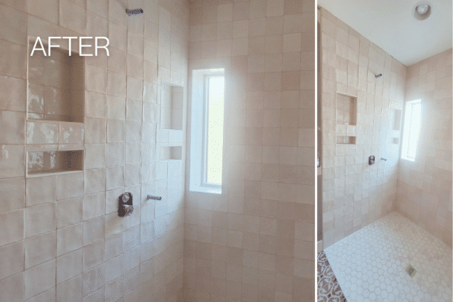 The original double brick exterior walls couldn’t just be tiled over. We furred them out, added foam board insulation, installed concrete board, and fully waterproofed the walls and shower pan before laying a single tile. Arizona Tile Flash Ivory 5×5 Zellige tiles cover the walls — a handmade, slightly irregular tile that catches light in a way ceramic never does. Dual-wall niches flank the windows symmetrically. A recessed vent fan/light with a vapor barrier sits flush in the ceiling. Glass enclosure, polished-nickel fixtures, no visual clutter.
