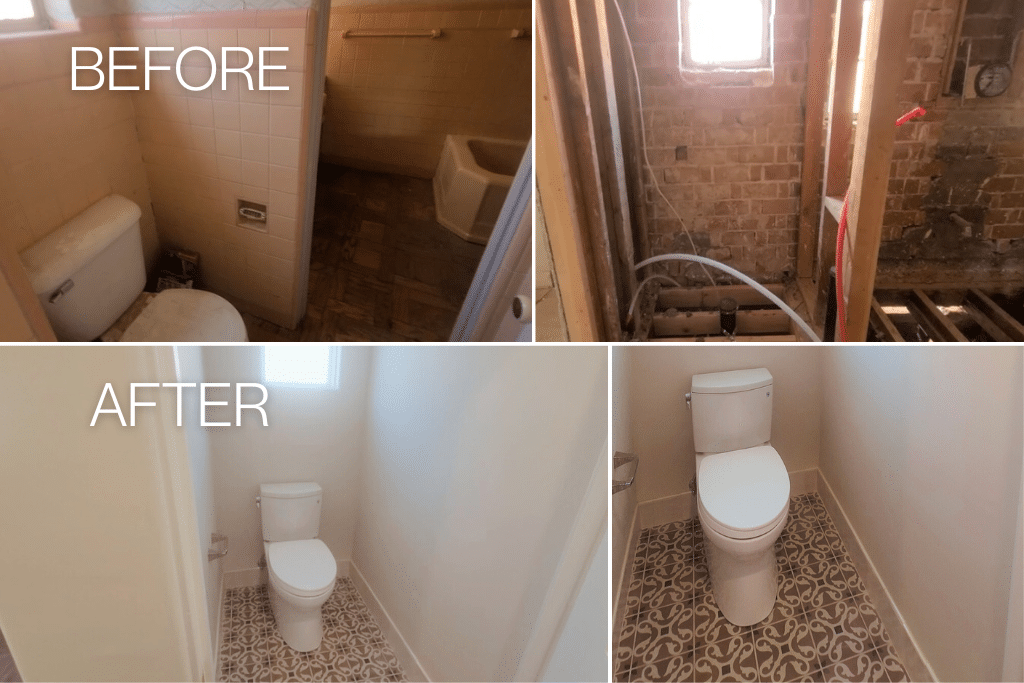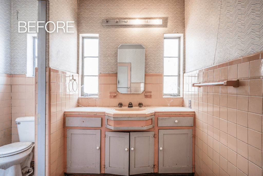 The original bathroom had accumulated decades of compromises. Pink tile from another era. A leaking shower that had long since stopped earning its place. A tub that ate up floor space without justifying it. An HVAC system that had been added after the fact, with ductwork crammed underground where nobody could easily reach it. A water closet with a furred-out wall eating into the clearance. Two doorways that interrupted what should have been a natural, flowing sequence between the closet, the vanity, and the shower.