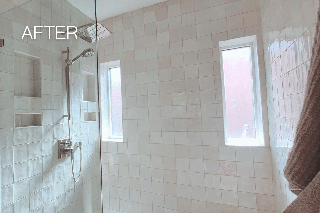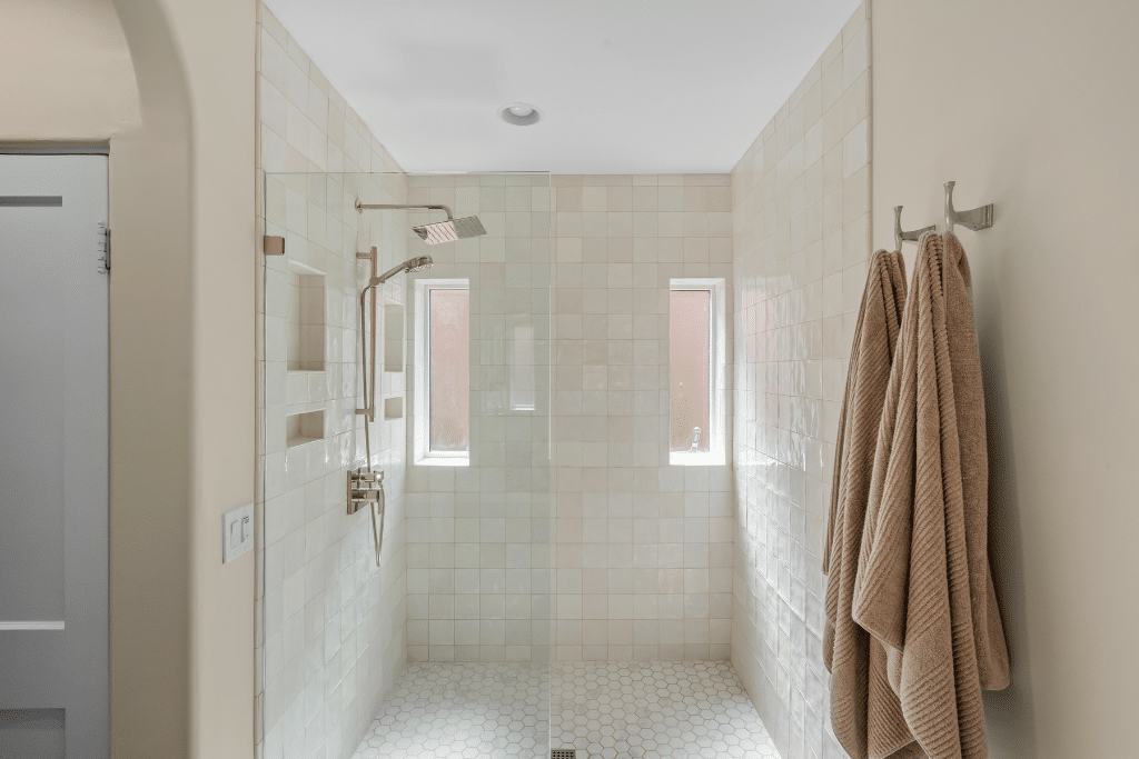 The original double brick exterior walls couldn’t just be tiled over. We furred them out, added foam board insulation, installed concrete board, and fully waterproofed the walls and shower pan before laying a single tile. Arizona Tile Flash Ivory 5×5 Zellige tiles cover the walls — a handmade, slightly irregular tile that catches light in a way ceramic never does. Dual-wall niches flank the windows symmetrically. A recessed vent fan/light with a vapor barrier sits flush in the ceiling. Glass enclosure, polished-nickel fixtures, no visual clutter.