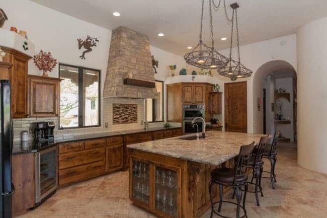 To preserve the boldness of the custom wood beam, key to the rustic kitchen remodel in Phoenix, we constructed a temporary wooden berm to support the mantel during installation. This allowed us to level it precisely and secure it with six-inch lag screws from behind, preserving the visual impact without burying the mantel under layers of stone and mortar. The temporary berm was a critical innovation, allowing our craftsmen to work with extreme precision. It provided a perfectly stable and level platform for the massive wood beam, ensuring its flawless alignment relative to the rest of the kitchen’s architecture. This meticulous process meant that the mantel’s rich, natural grain and substantial proportions remained fully exposed and celebrated.