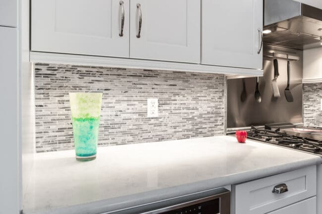 Under-cabinet LED lighting provides clear task illumination while highlighting the texture of the backsplash. Interior cabinet lighting adds warmth and depth, especially in the evening.